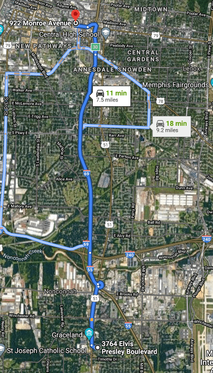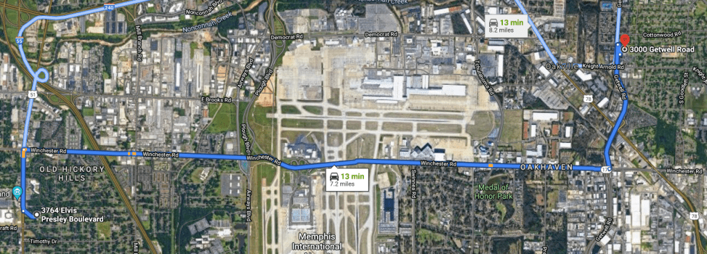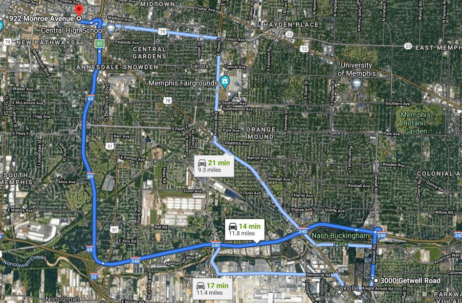 Here are the routes in question (3000 Getwell is Doctors Hospital, 922 Monroe is BMH, and 1300 Wesley is Methodist South):